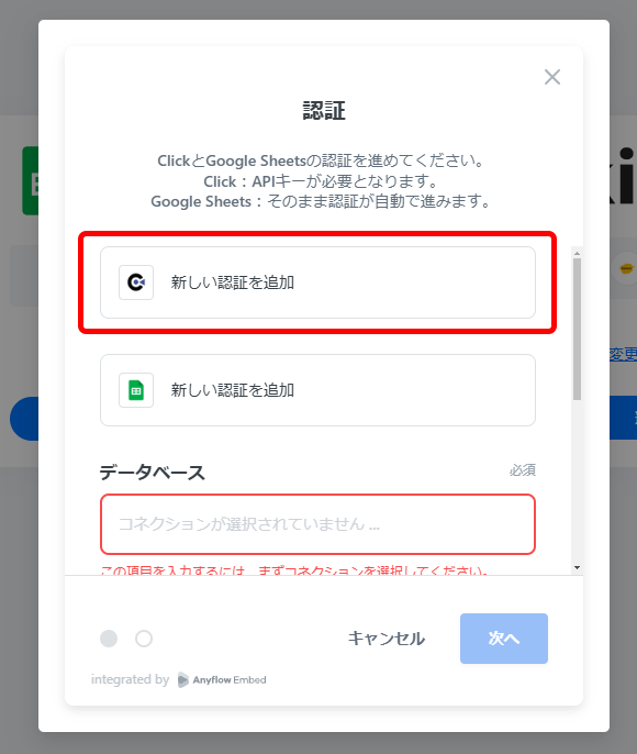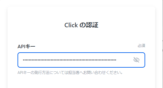 〔新しい認証を追加〕をクリックし、取得済みのClickのAPIキーを入力してください。
