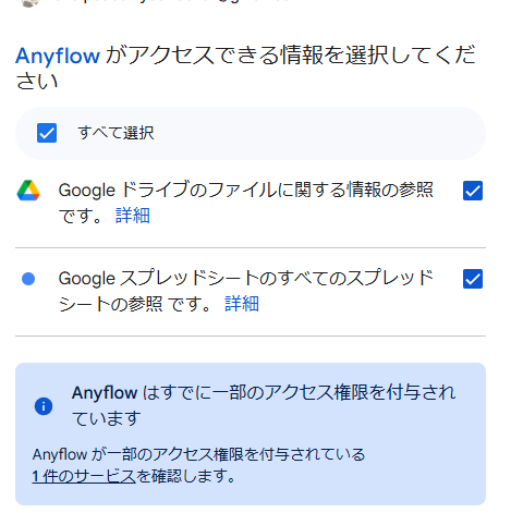 〔Anyflow〕に移動しますので、Anyflowのプライバシーポリシーと利用規約をご確認して頂き、連携させたいGoogleアカウントを選択します。