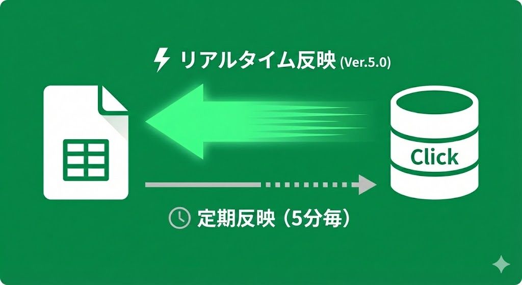 GoogleスプレッドシートからClickへのデータ反映(読み込み)は、5分おきに行われます。