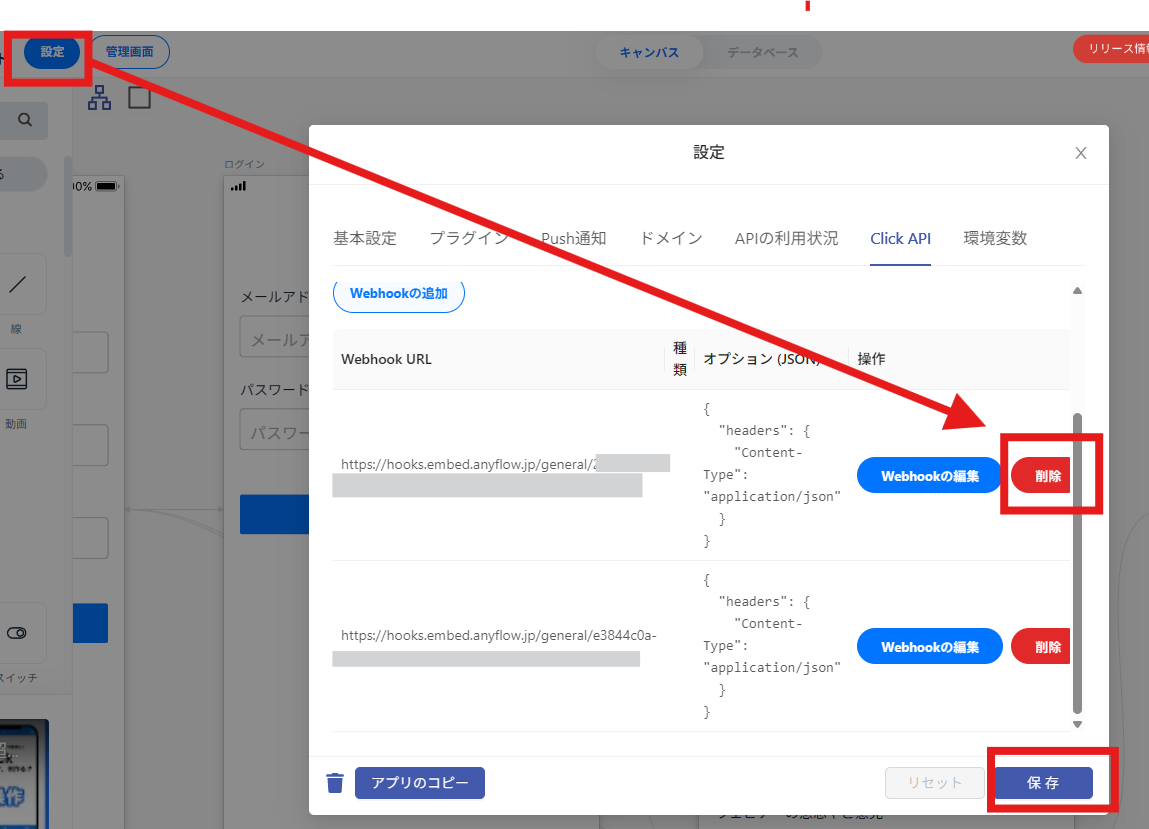キャンバス左上の「設定」から、Webhookの追加・編集・削除を行う事ができます。