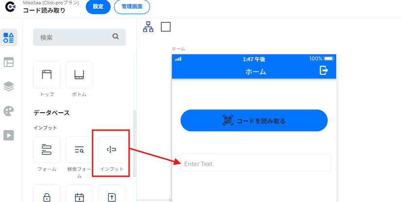 キャンバス左側パネルのインプットにある「コード読み取り」エレメントを、ページ上に配置してください。