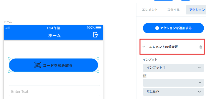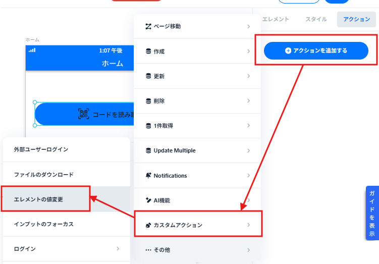 「コード読み取りエレメント」を選択した状態で、「アクション>カスタムアクション>エレメントの値変更」と選択して下さい。