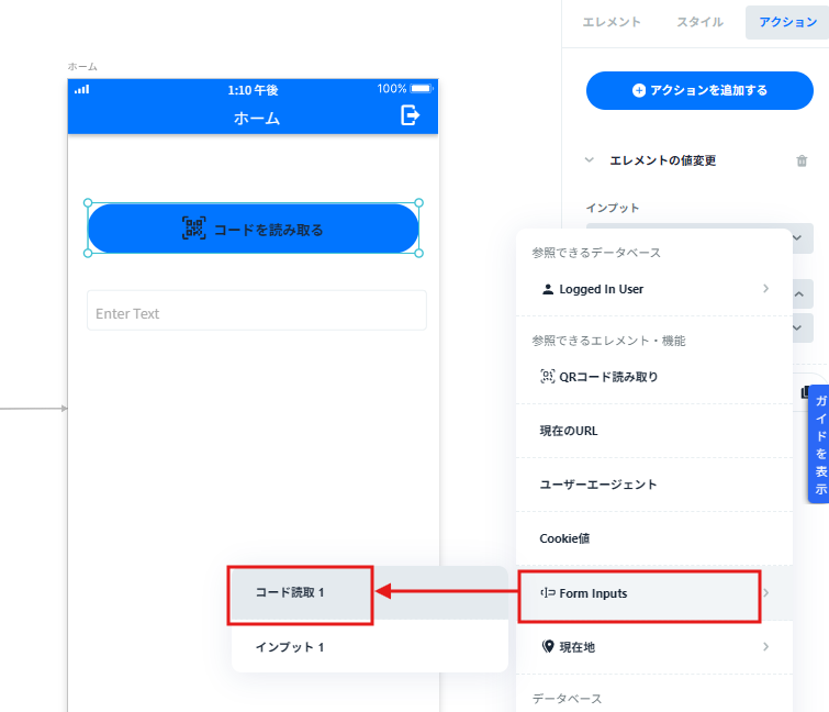 次に、値を、「参照できるエレメント・機能」内の「Form Inputs>コード読み取り1」に設定してください。
