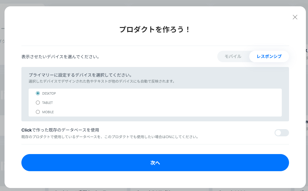 「新規プロダクト作成」ボタンをクリックすると画面が表示されます。デフォルトはモバイルのみです。