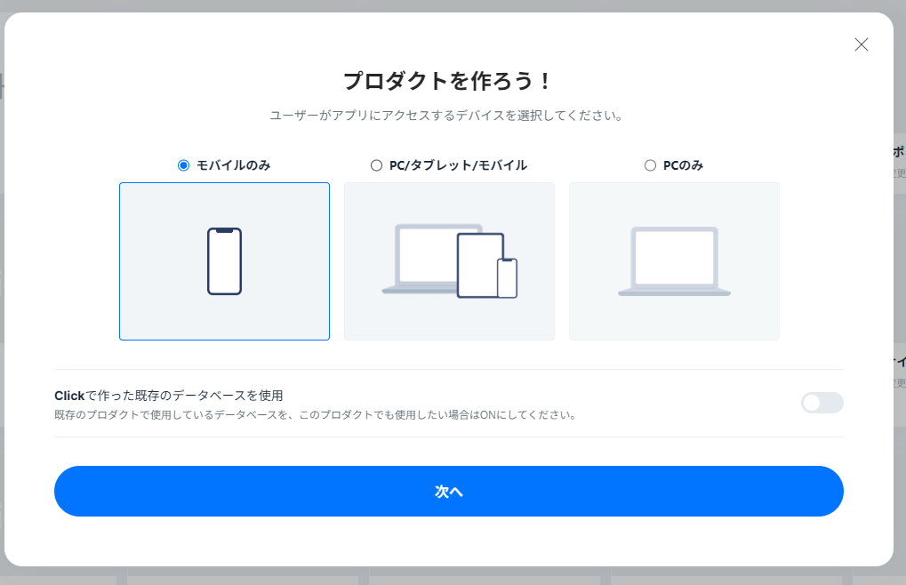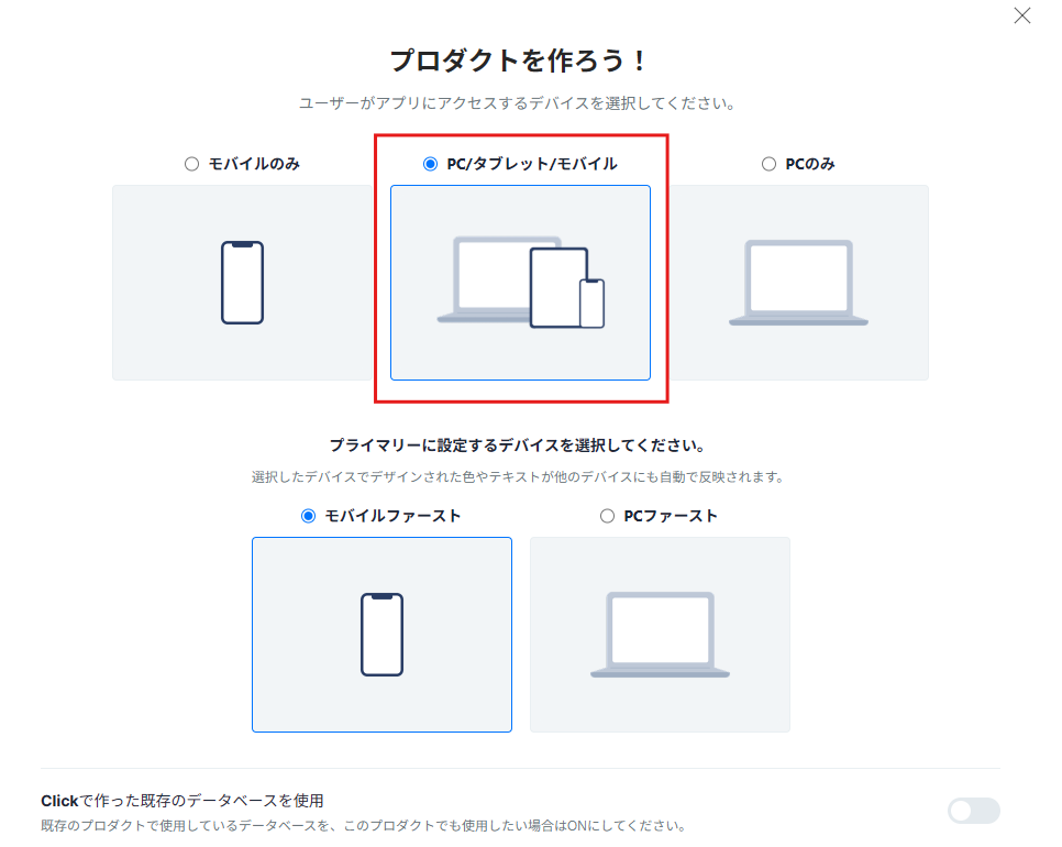 - 「次へ」ボタンをクリックすると、「ユーザーがアプリにアクセスするデバイスを選択してください」 と表示されます。レスポンシブ対応で作成する場合は、中央の 「PC/タブレット/モバイル」 を選択します。