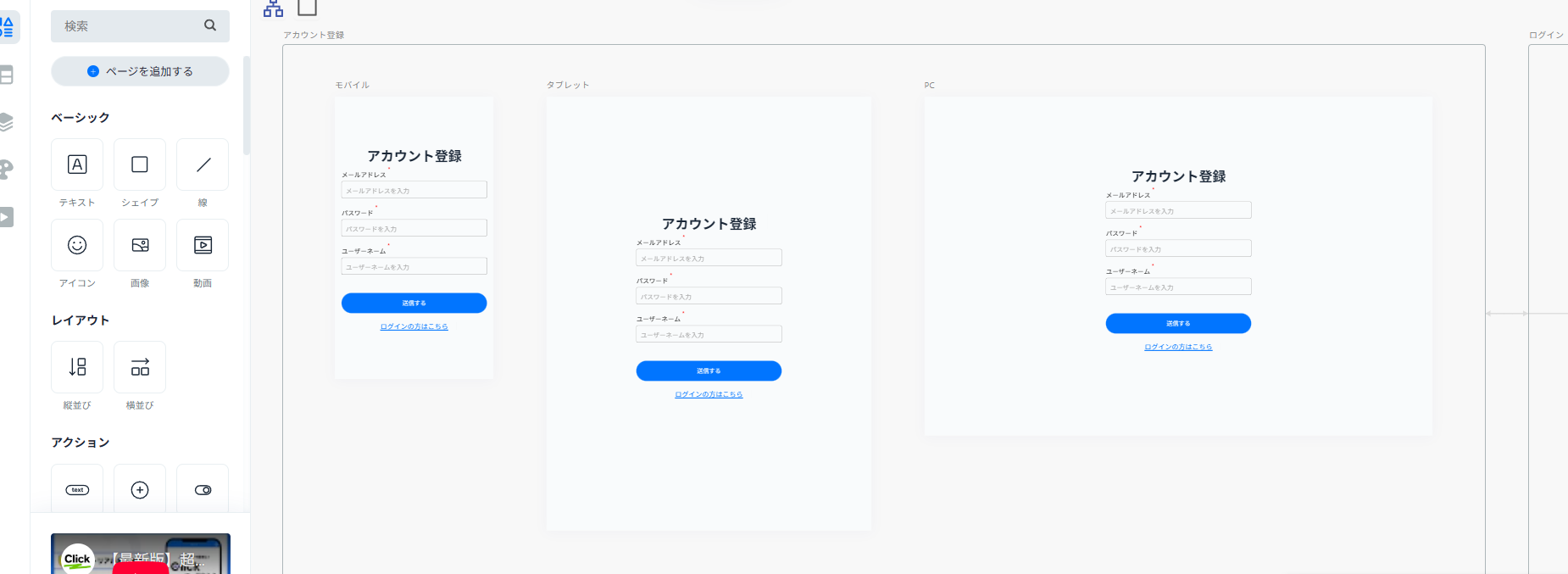 キャンバス画面に3つのページが表示されます。プライマリーデザインを設定したデバイスページを中心にデザインやアクション設定を行ってください。