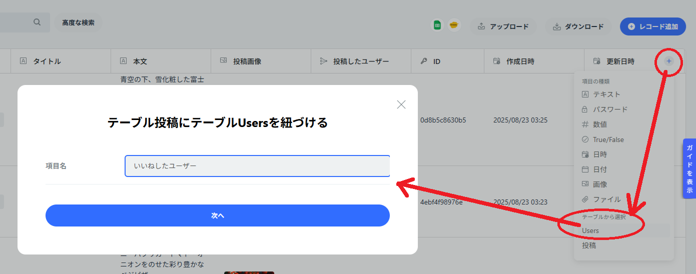 投稿テーブルの項目追加アイコン(+)をクリックし、”テーブルから選択”の”Users”を選択します。項目名の入力フォームがでますので、”いいねしたユーザー”と入力し、次に進みます。