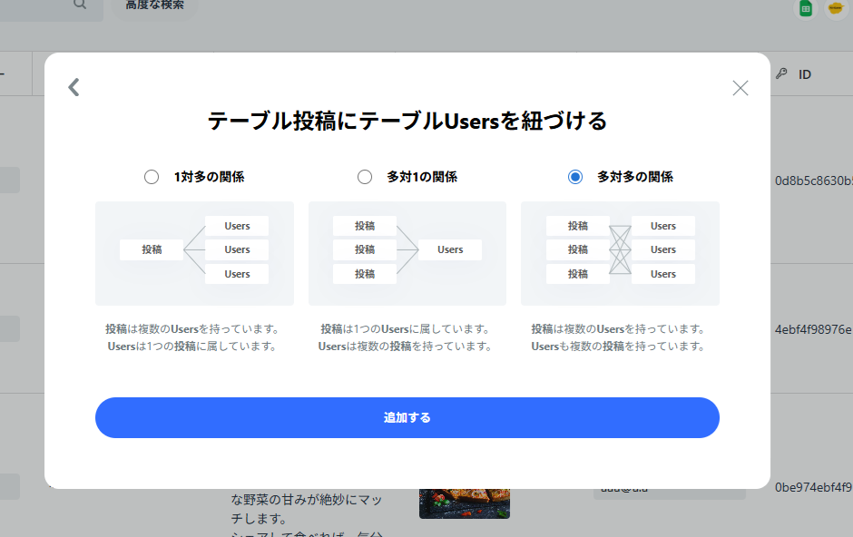 リレーションの種類は「多対多」を選択します。