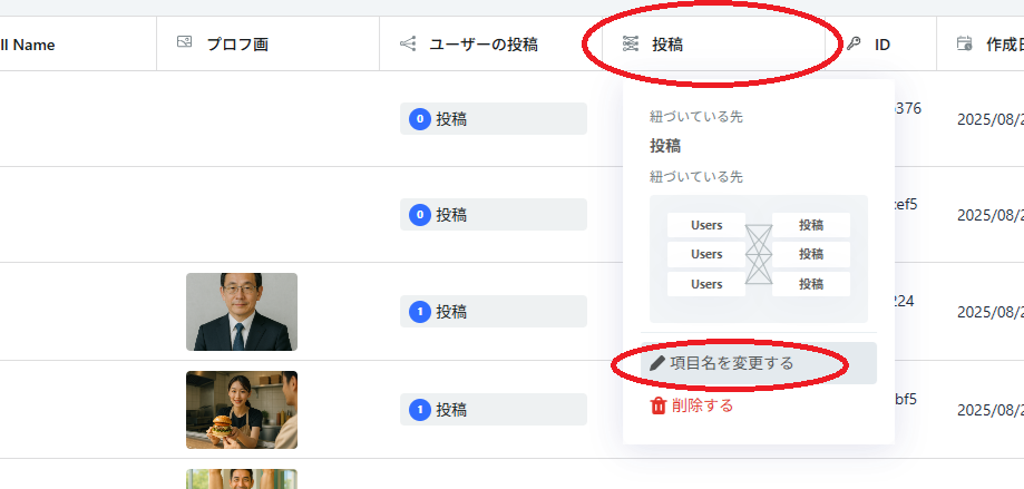 項目名”投稿”をクリックし、”項目名を変更する”で項目名を変更する。