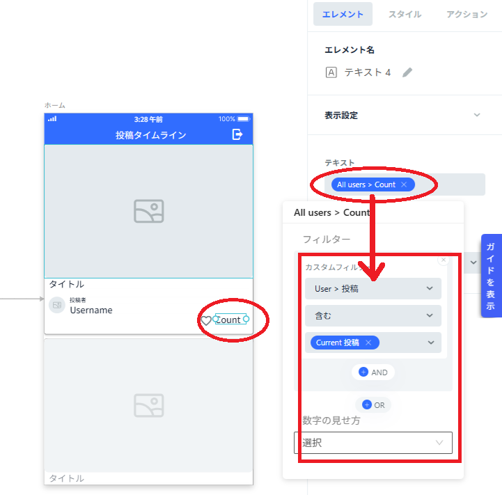 いいね数を表示するテキストエレメントに以下の設定をする。この設定により「この投稿にいいねしたユーザーの数をカウントする」という処理がなされる。
