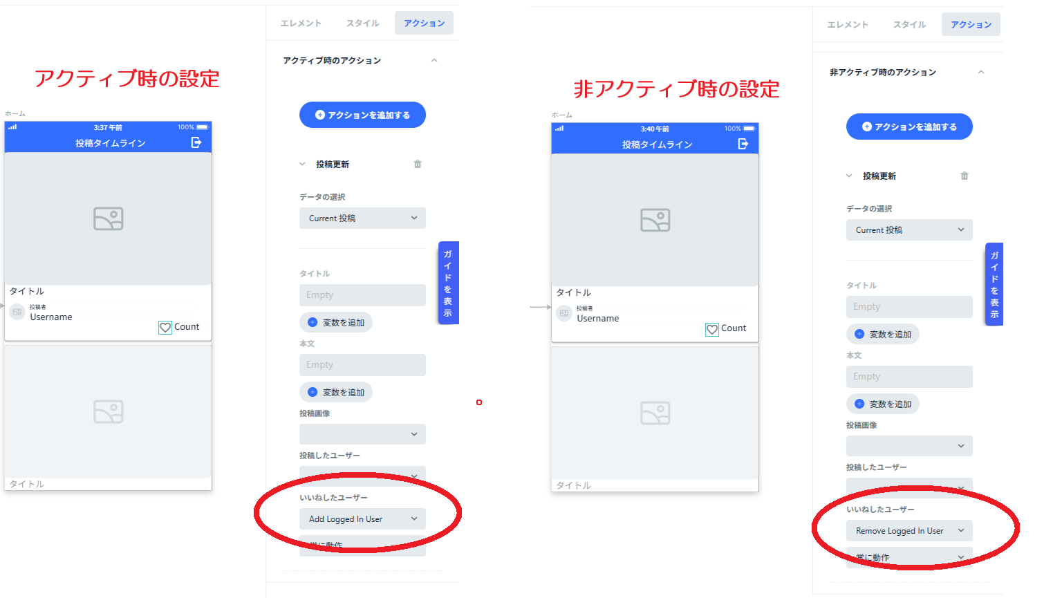 上記設定により、ハートアイコンをいいねしてアクティブになったときに、投稿をいいねしたユーザーとしてログインしているユーザーを追加する、という処理が設定されました。