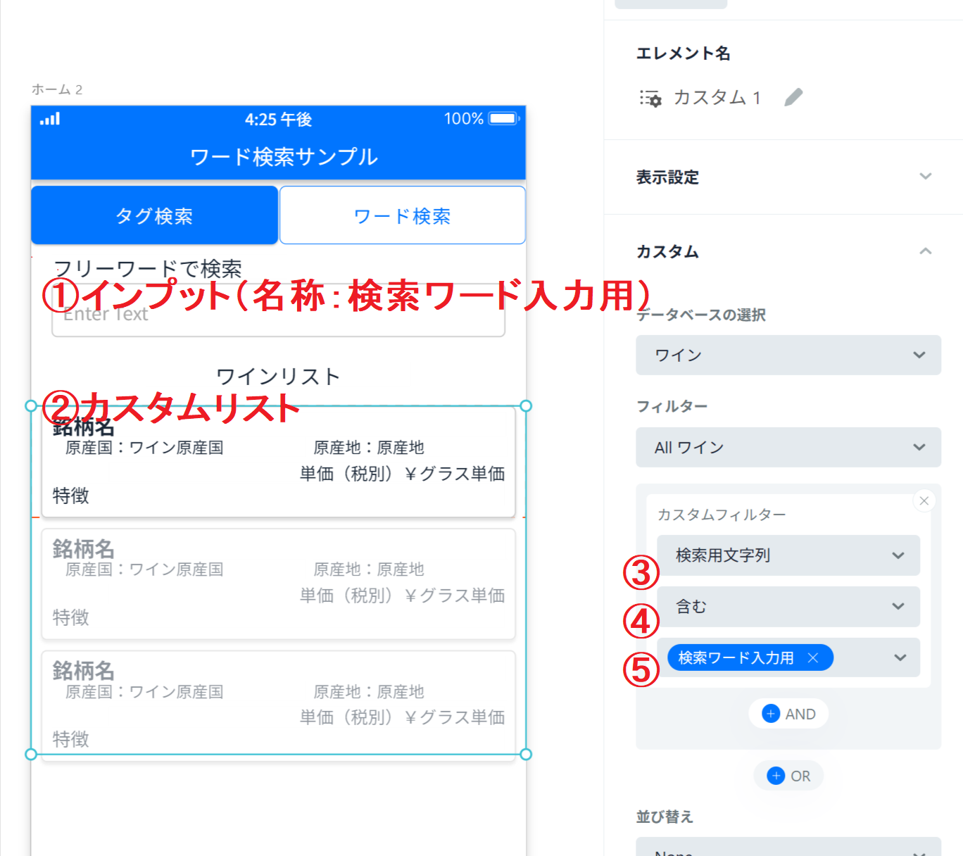 ⑤.絞込に使用する検索語を入力するエレメント”検索ワード入力用”を指定します。