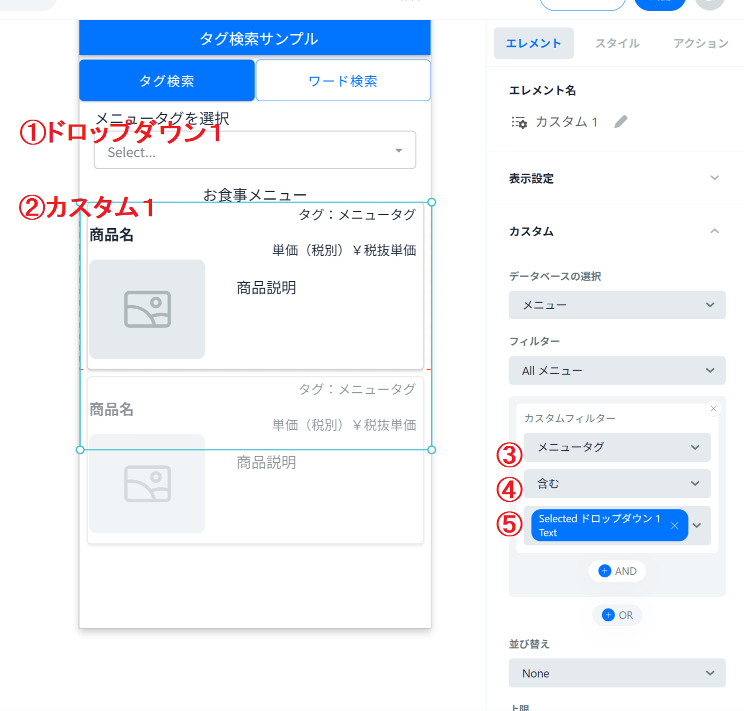 ⑤絞り込みに使用するタグを選択するエレメント(例:ドロップダウン1)を設定します。