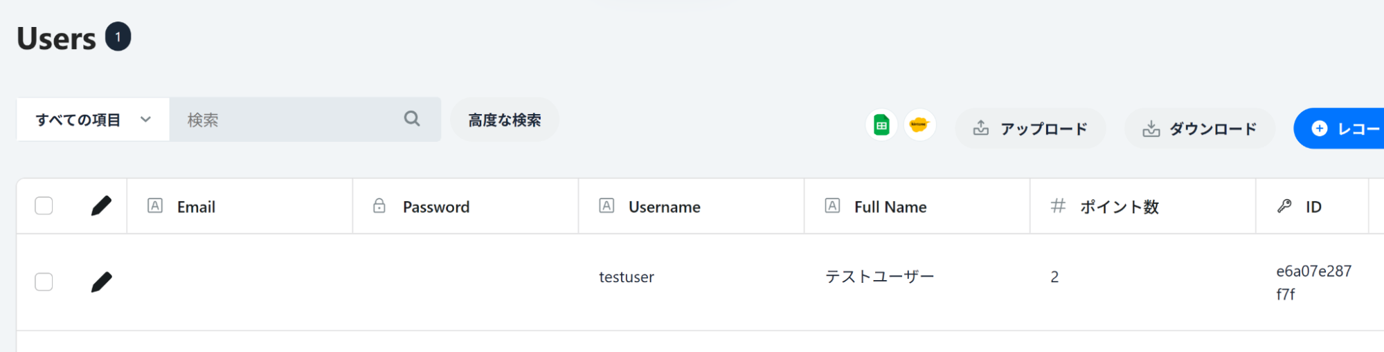 `Users`テーブルに、`ポイント`項目(数値型 )を追加します。初期値が0になるよう、ユーザーの新規登録のアクションで0を入力するようにします。