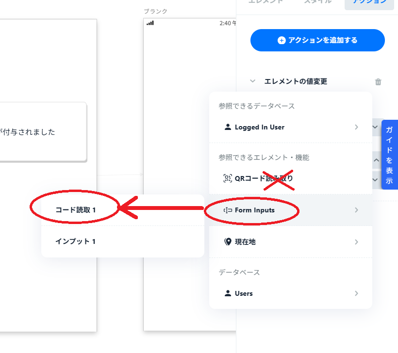 3.コード読み取りエレメントのアクション設定で、エレメントの値変更を選択し、インプットの値にコード読みとり結果を入力する。