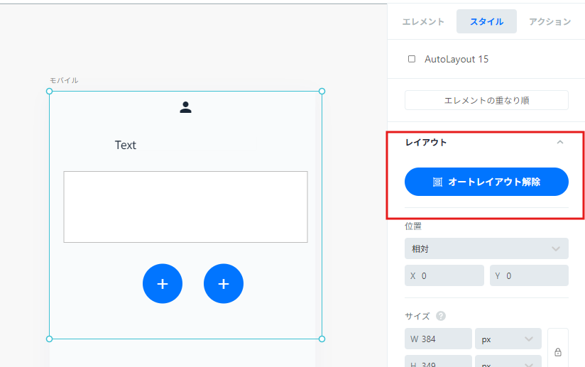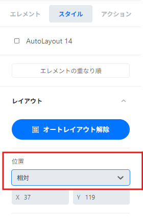 ページをオートレイアウトにしていない場合は、エレメントを配置後に、そのエレメントの右側パネルないのスタイルから、位置をデフォルトの「絶対」から「相対」に変更してください。※エレメントのレイアウトで絶対配置を使用している場合、オートレイアウトの設定は反映されません。