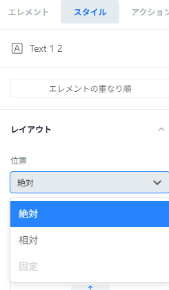 - エレメントスタイルのレイアウトを「相対配置」から「絶対配置」にしてください。
