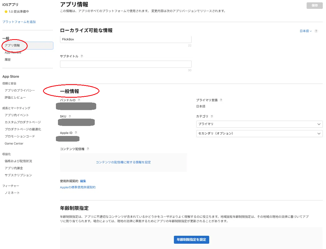 この2点になります。記入がない場合は、審査に提出しようとしてもエラーになります。エラー原因が表示されるので、プライマリカテゴリや年齢制限に関するエラーであれば、ここをチェックしましょう。