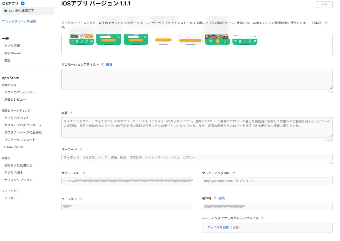 アプリの内容を説明するものでストアのプロダクトページにも表示される内容です。アプリ検索の対象にもなります。しっかり記入しましょう。