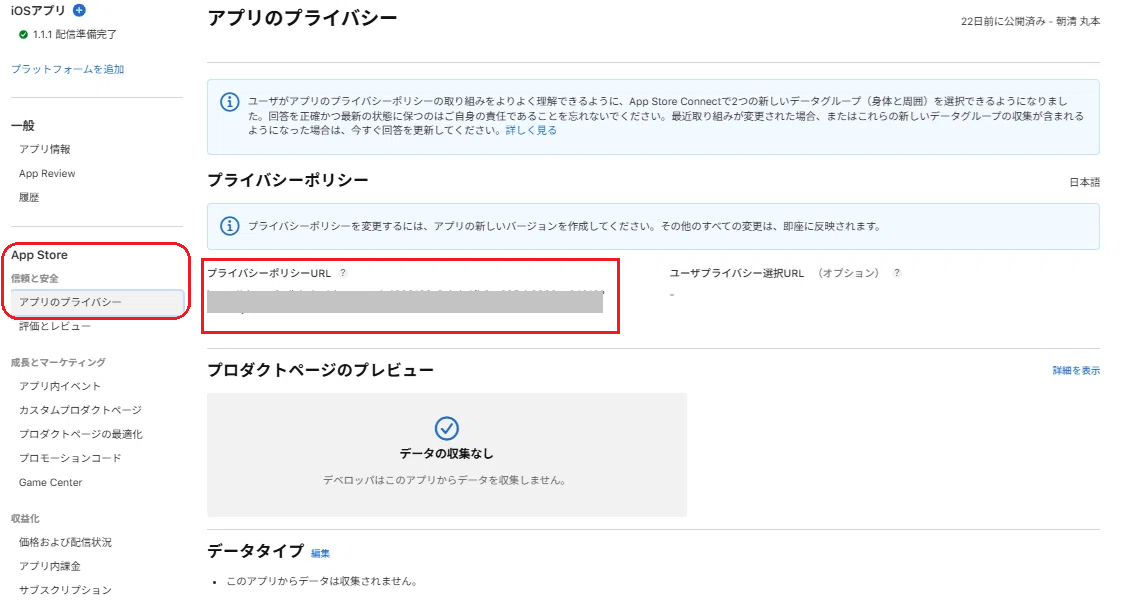 プライバシーポリシーURLを入力するところがあるので入力を完了しておきます。未入力の場合は申請することができません。