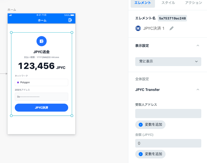 JPYCエレメントでは、変数を追加 → JPYC決済1 から以下の3つの情報を取得できます。