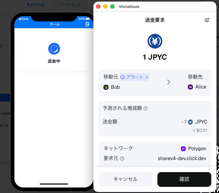 決済ボタンを押すと、設定した金額でウォレットへ送金リクエストが送られます。