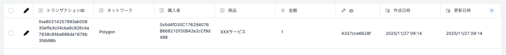 決済が完了するとブロックチェーンだけではなく、ClickのDBにも購入履歴が作成されます。購入履歴の一元管理を行いたい場合や商品名など追加情報を保持したい場合におすすめです。