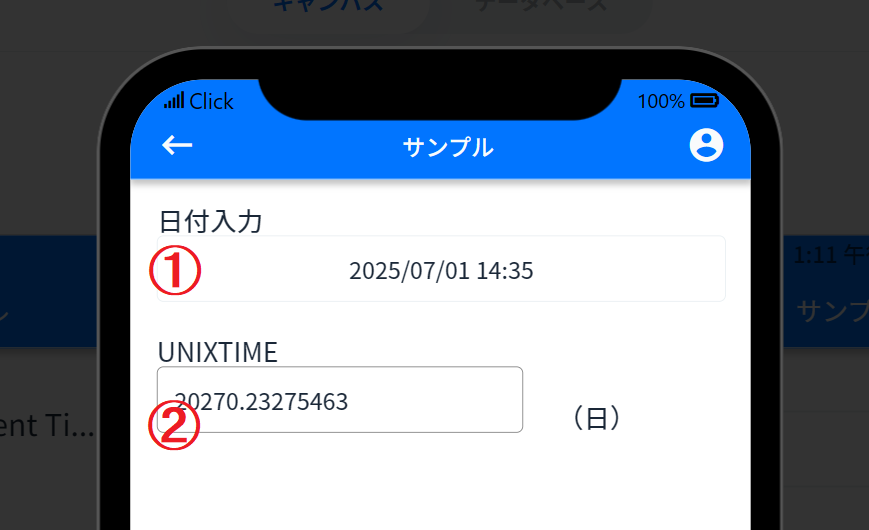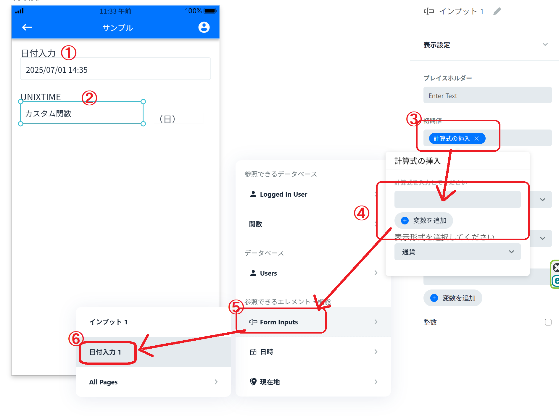 ②unixtimeを表示するためのインプットエレメント(数値タイプ、カスタム関数を選択)。