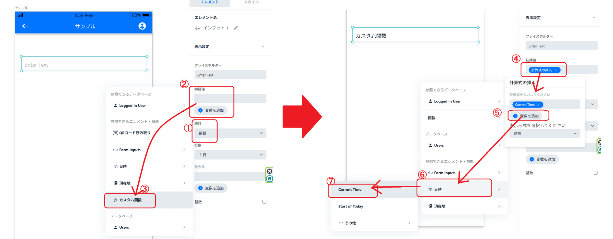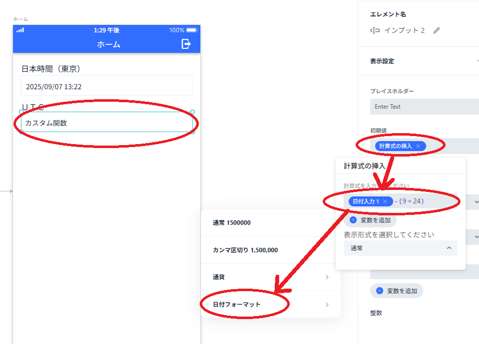 3.テキストエレメントの初期値を”カスタム関数”として、中身に”日付入力エレメント”を参照して、時差分をプラスまたはマイナスする。