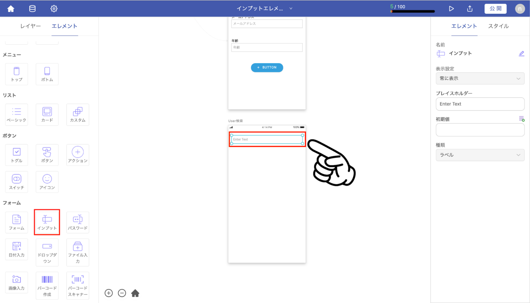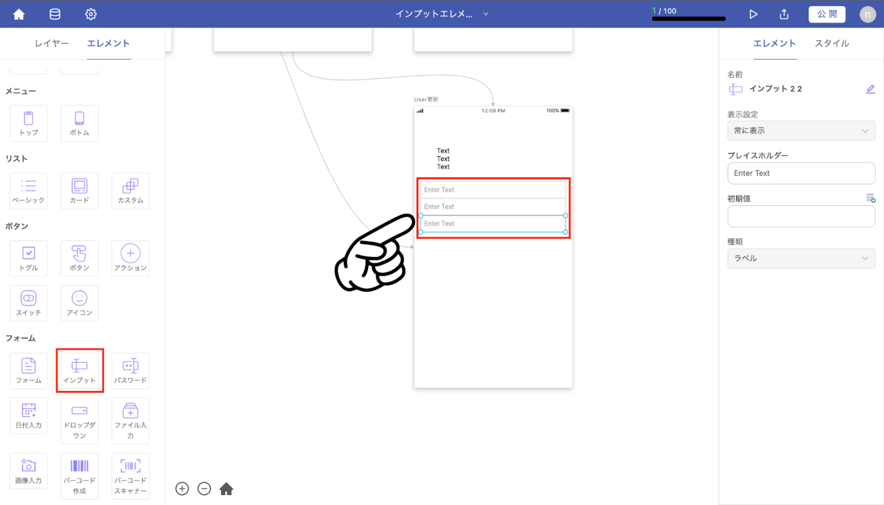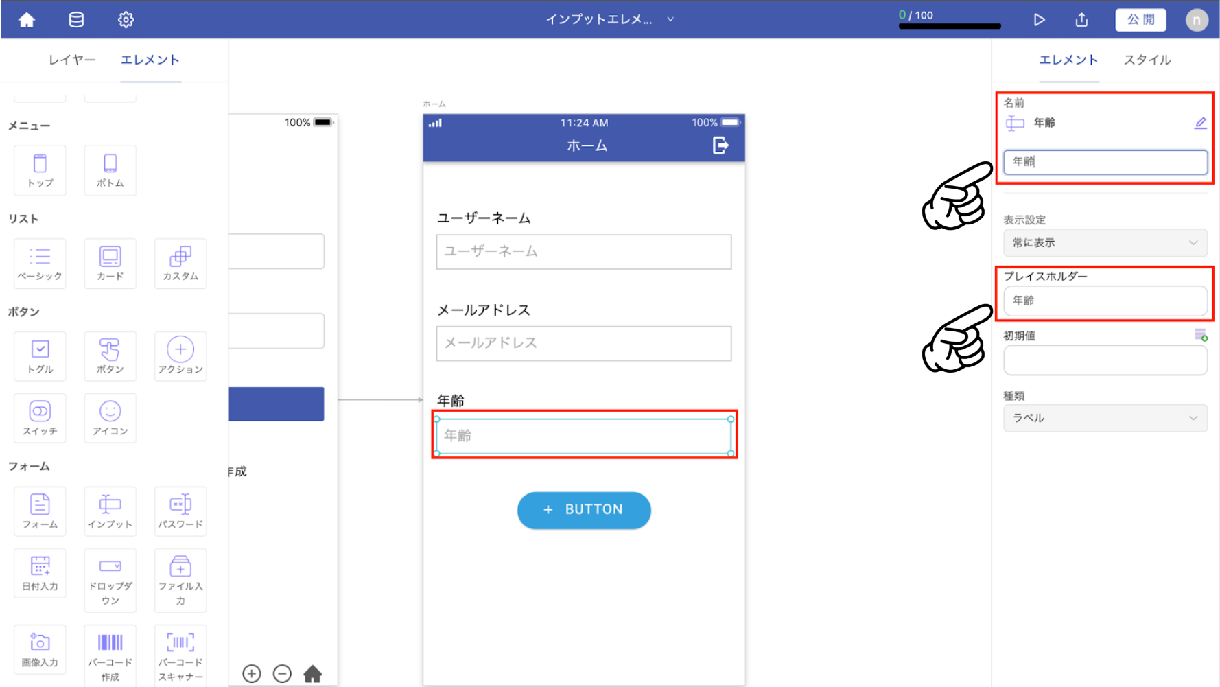 それぞれのインプットエレメントの名前とプレイスホルダーの設定をします。インプットエレメントを選択し、テキストエレメントと同様の名前に変更します。