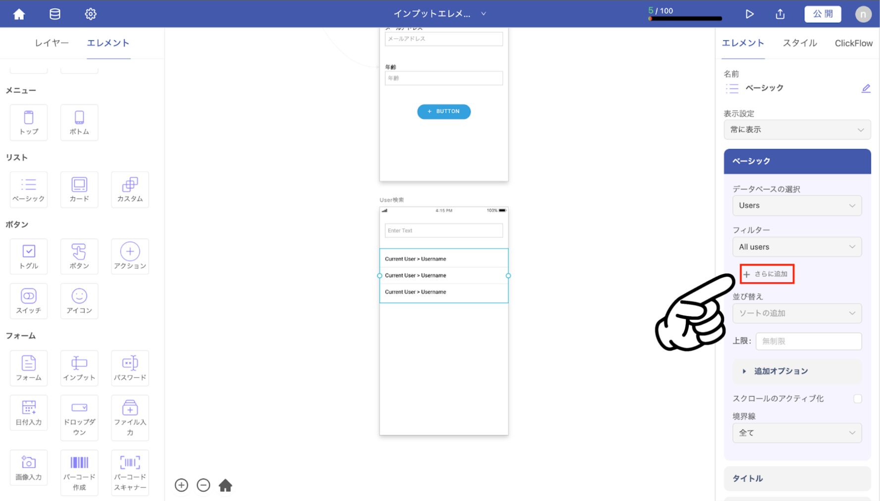 ベーシックリストを配置し右ウインドウ「ベーシック」タブを開き「Users」テーブルを選択する。サブタイトル、サブタイトル2、左セクションのスイッチをオフにする。