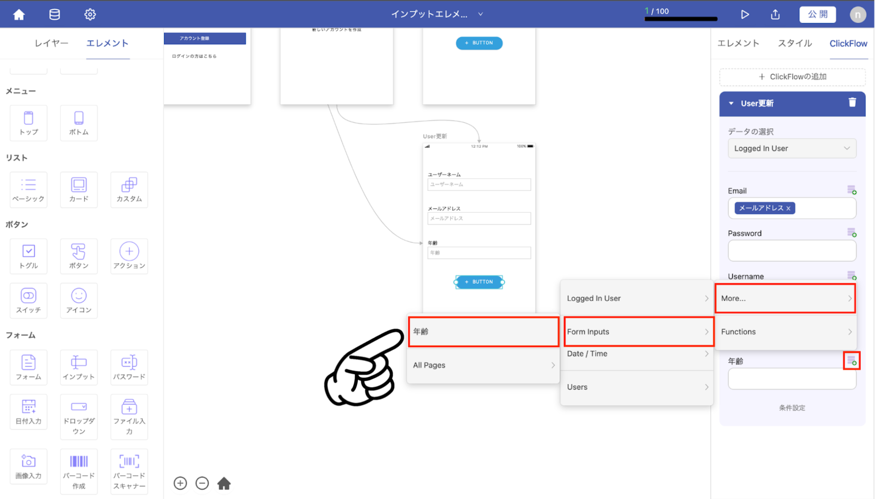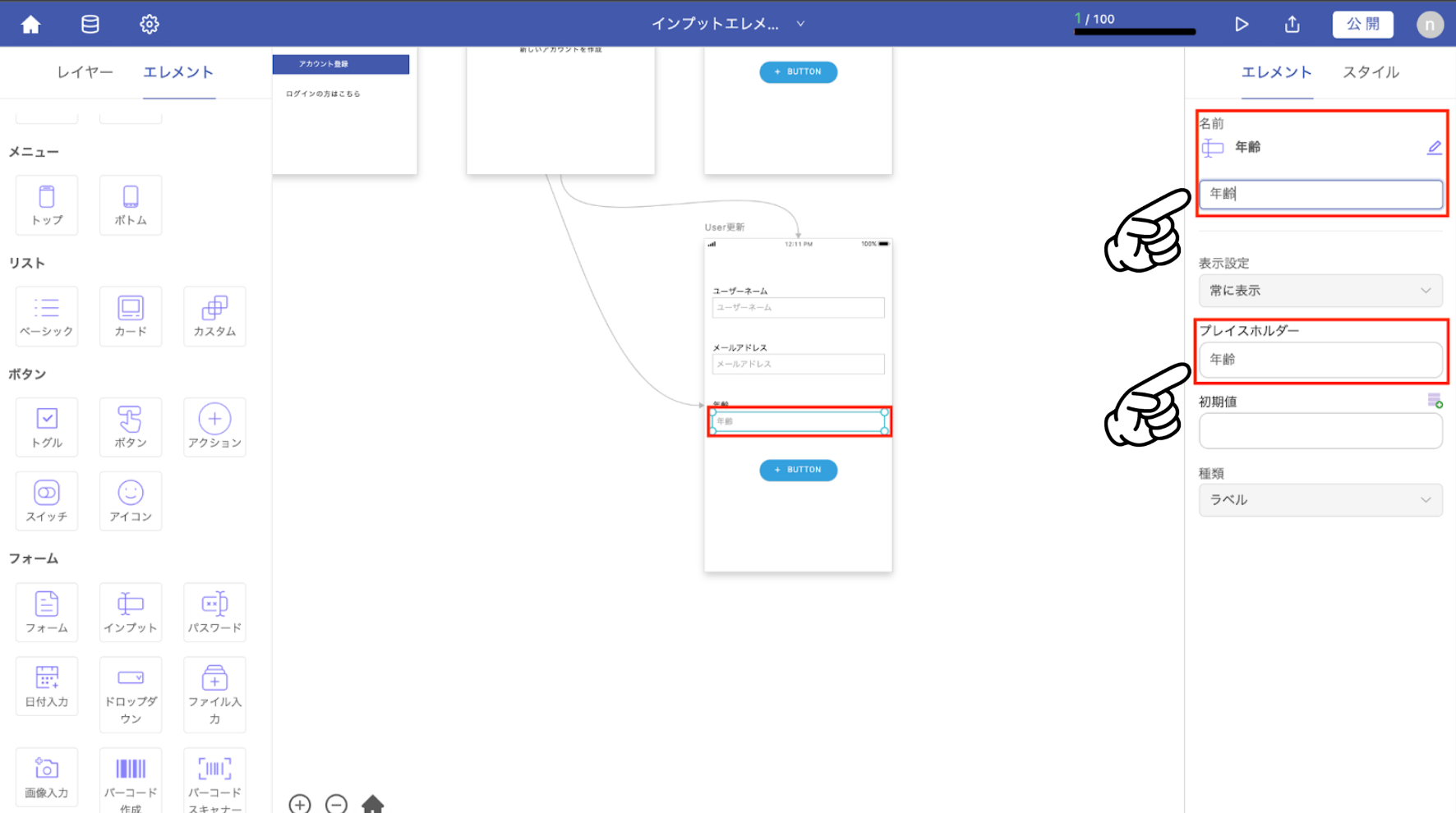 メールアドレスのインプットを選択し、「種類」を「メールアドレス」に変更します。年齢の「種類」を「数値」に変更します。