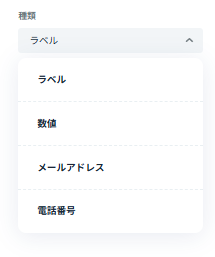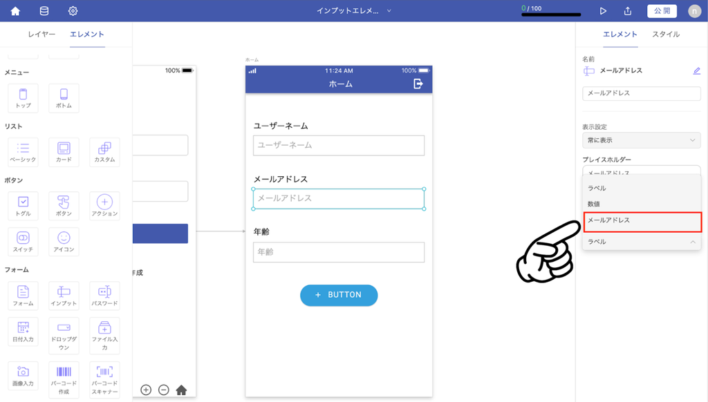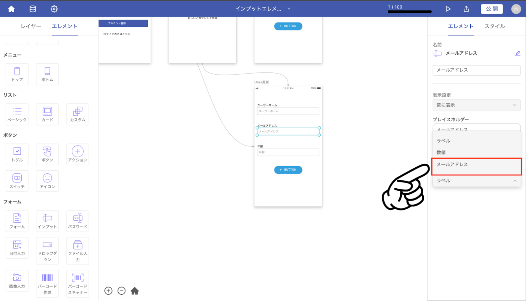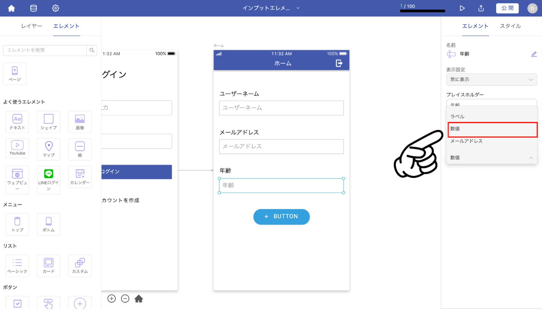 メールアドレスのインプットを選択し、「種類」を「メールアドレス」に変更します。年齢の種類は「数値」に変更します。