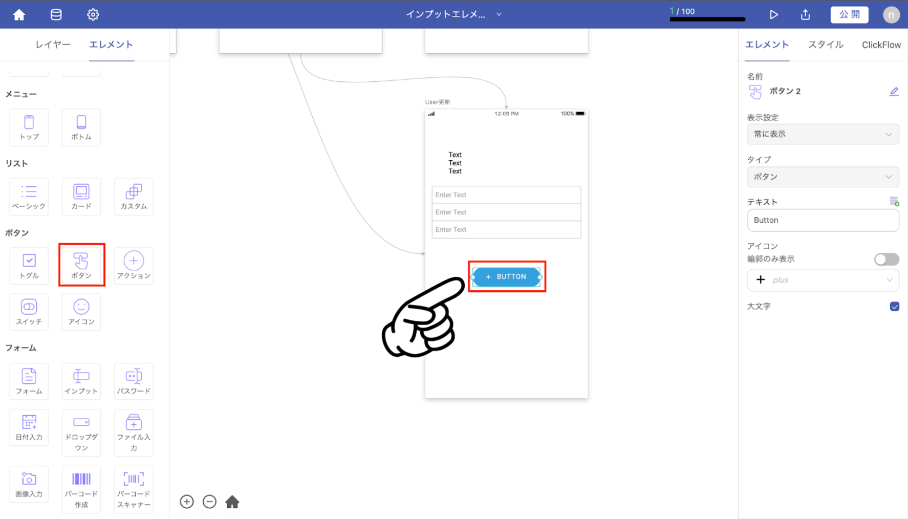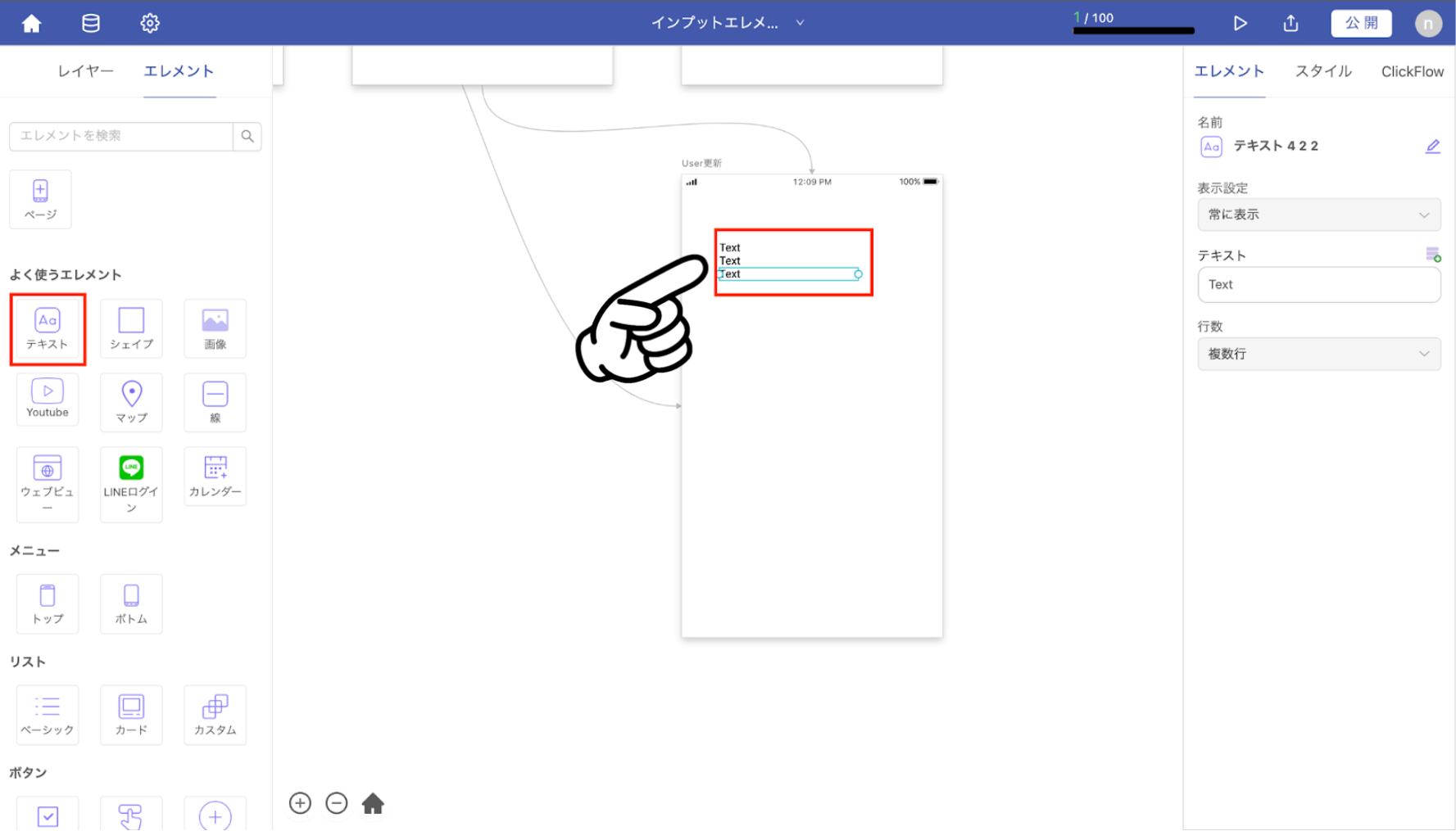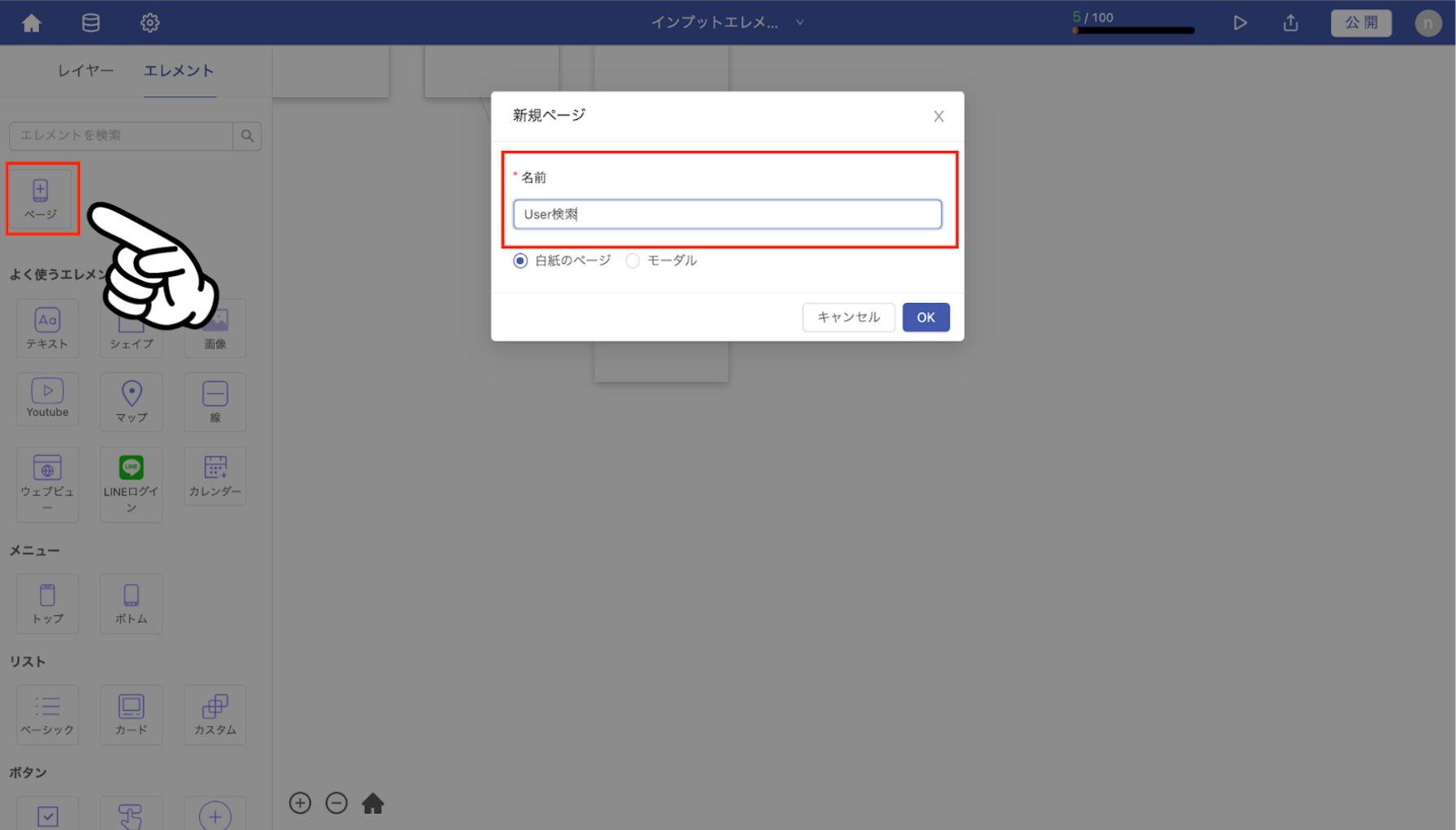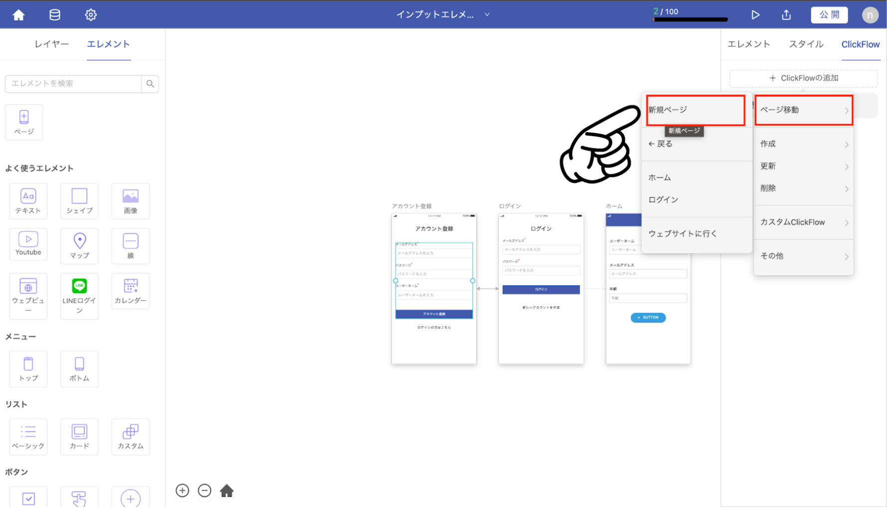 新規ページに「テキストエレメント」と「インプットエレメント」を3つずつ、ボタンエレメントを1つ配置する。