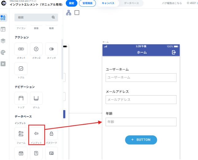 キャンバス画面に移動し、インプットエレメントとテキストエレメントを3つずつと、ボタンエレメントをページに配置する。