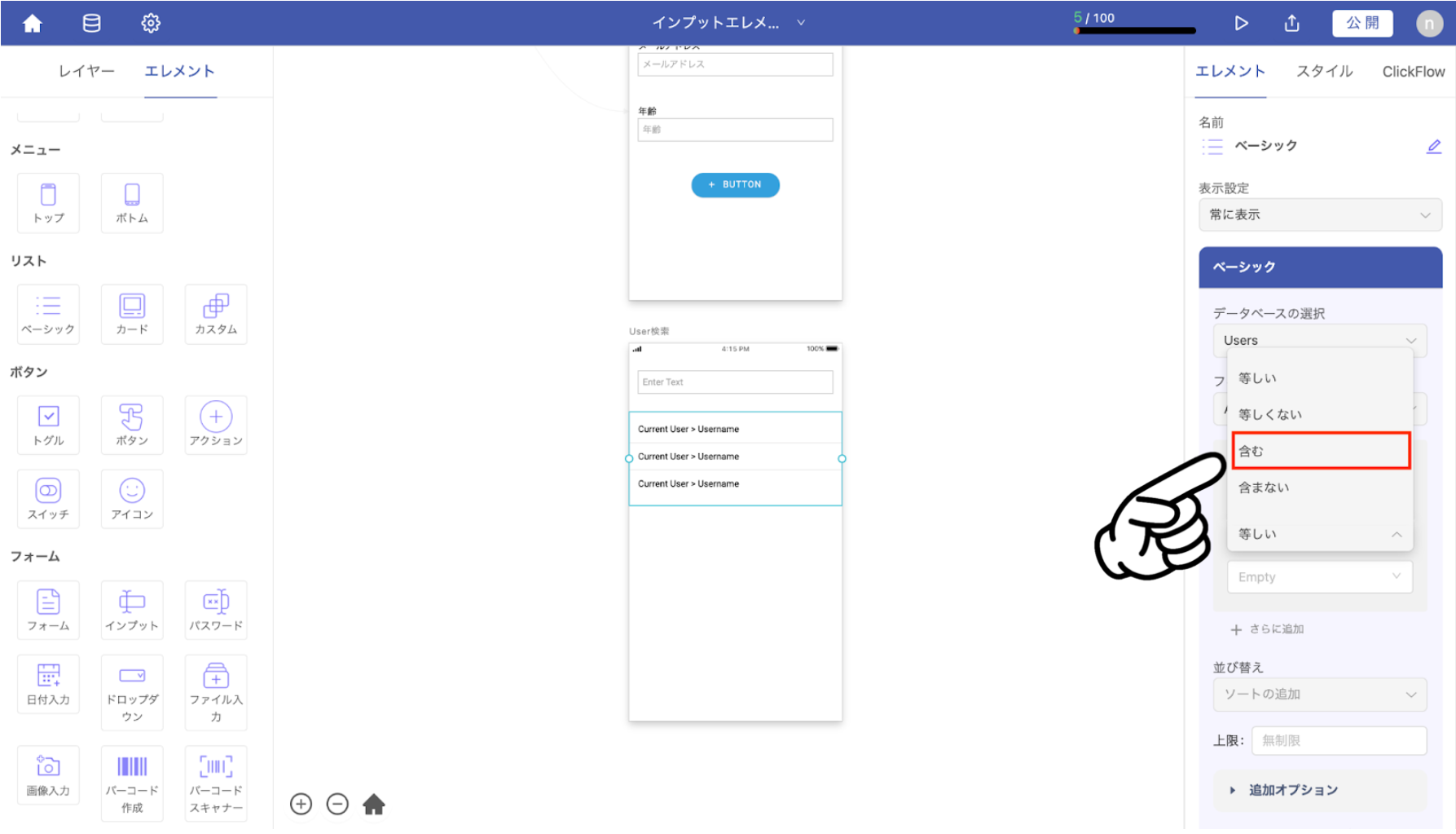 フィルターの条件を設定します。インプットに入力された値を含むデータを表示させます。