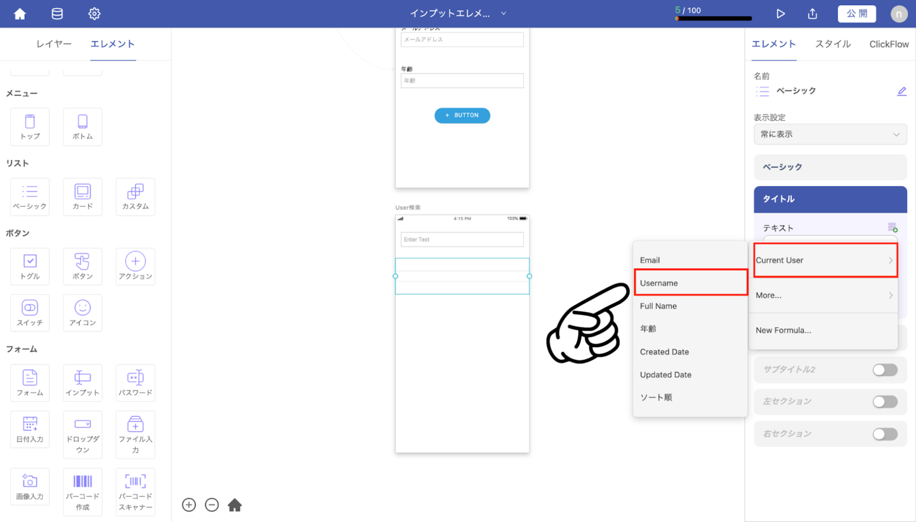 - Usernameには〔変数を追加〕>〔Form Inputs 〕> 〔ユーザーネーム〕を選択します。