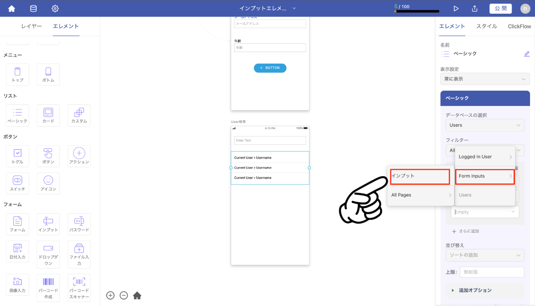 インプットエレメントはデータの作成・更新 以外にも他のエレメントと組み合わせることで多様な機能を実装することが可能である。