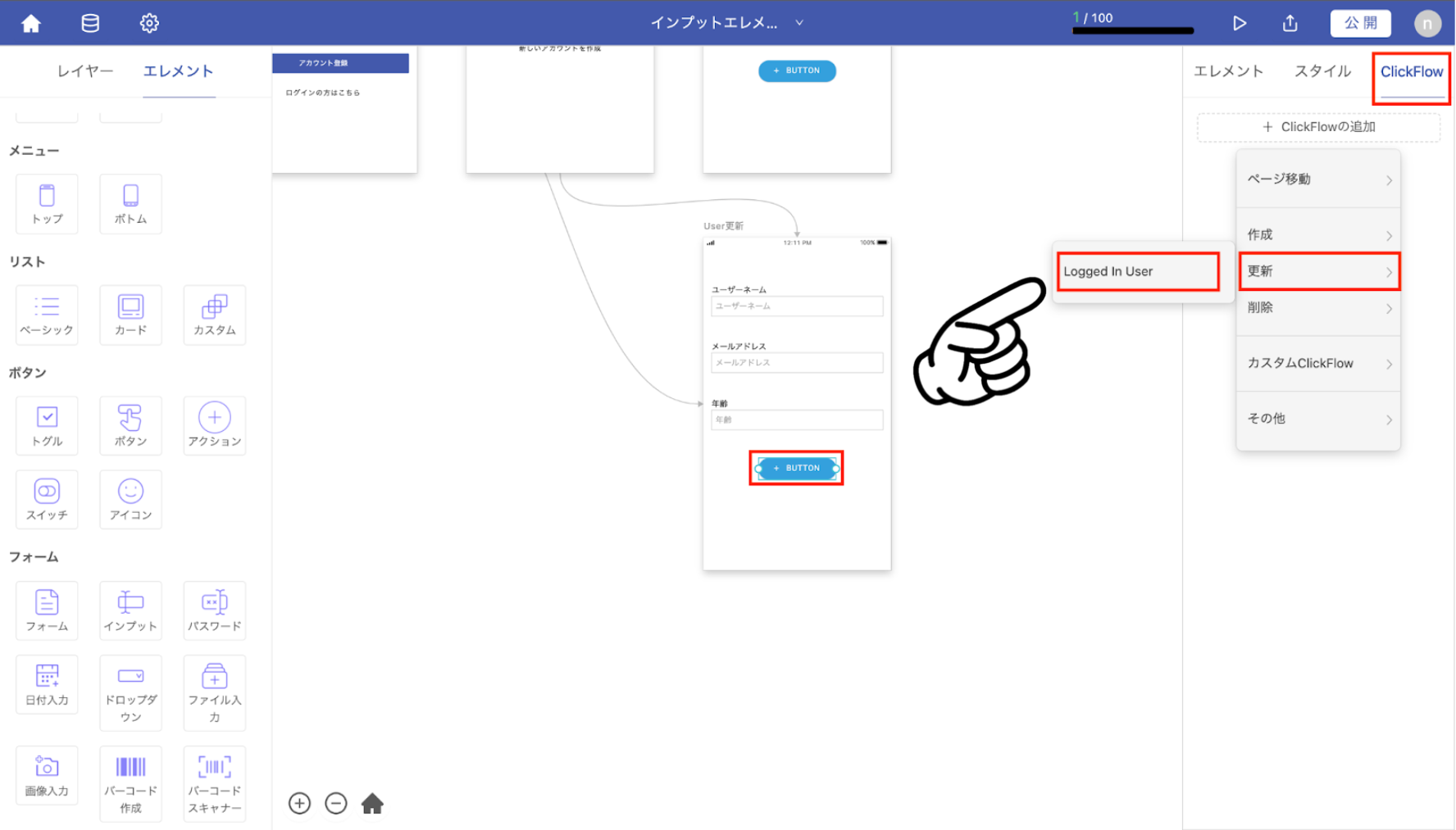 ボタンを選択し、右ウインドウ「アクション」タブから アクション を設定する。「+ アクションの追加」から「更新 > Logged in User」を選択する。