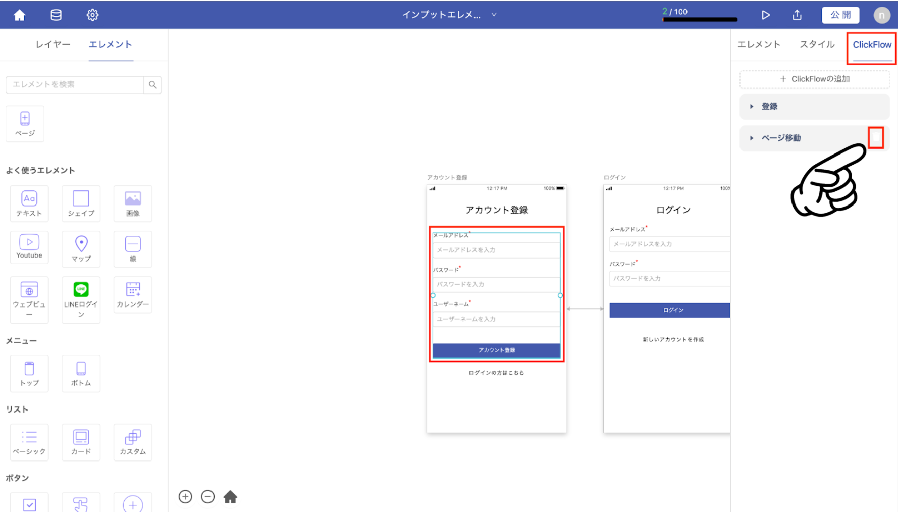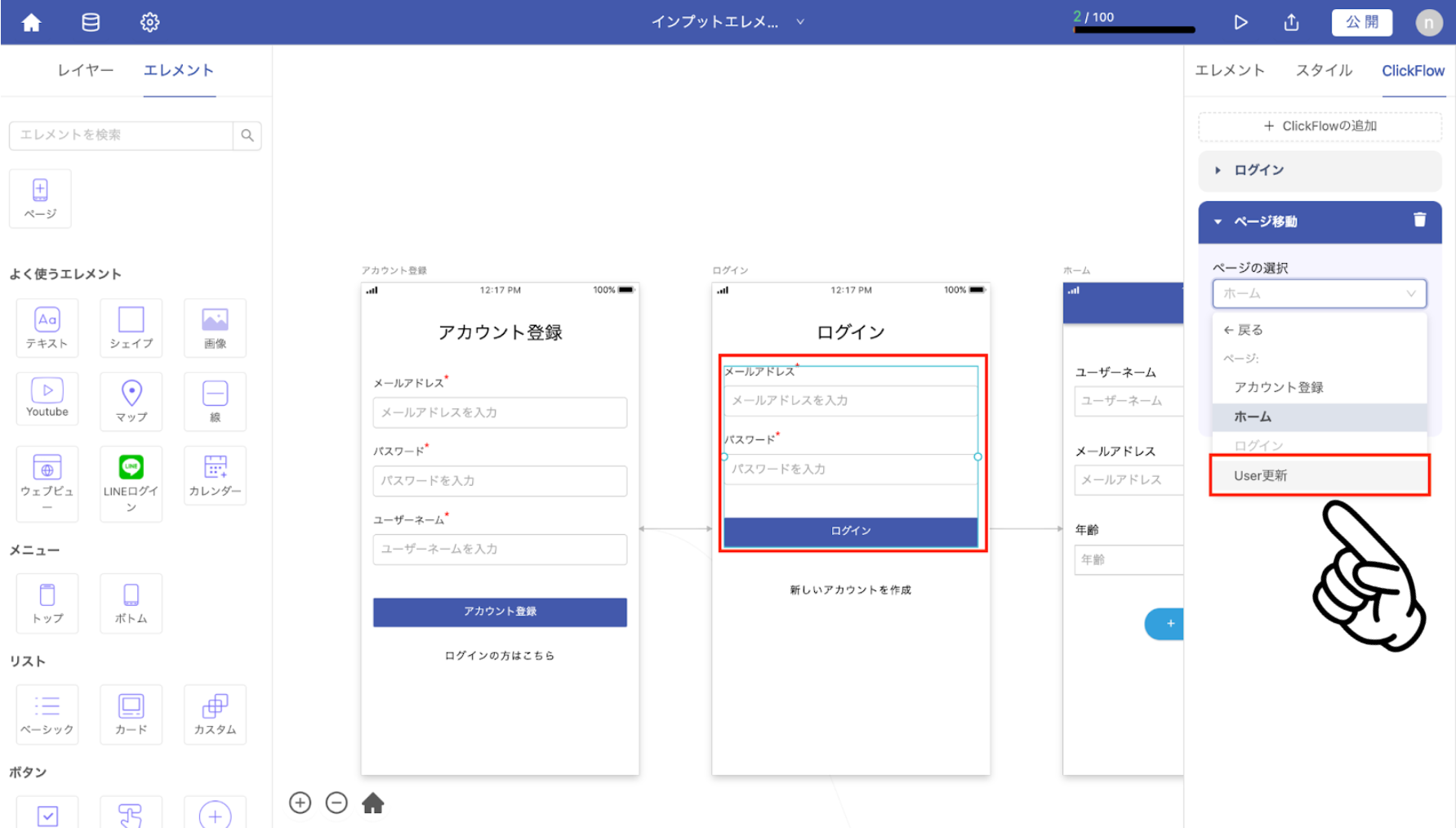 ログインページのフォームを選択し、右ウインドウの アクション「ページ移動」の遷移先を先ほど作成したページに変更する。