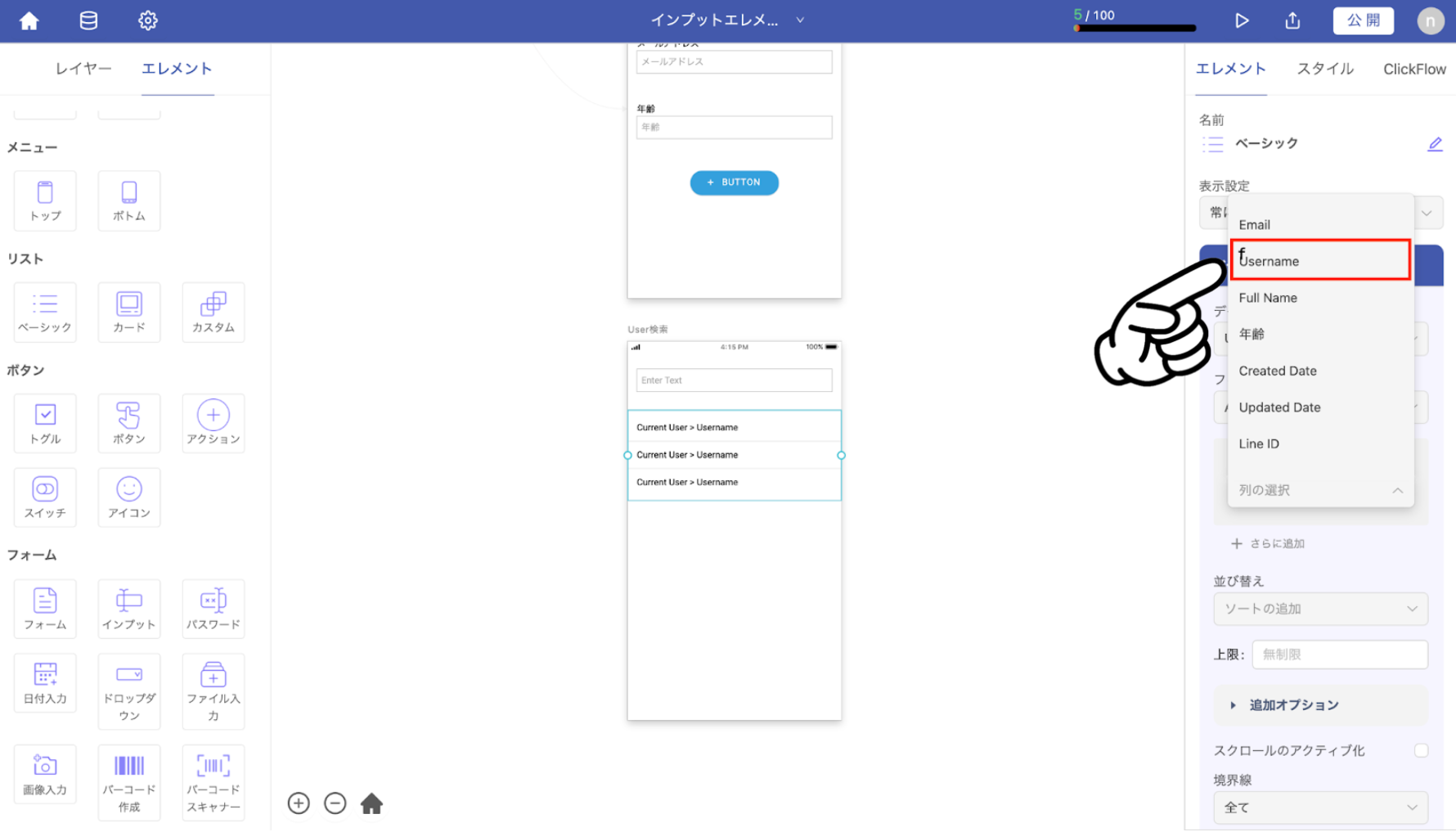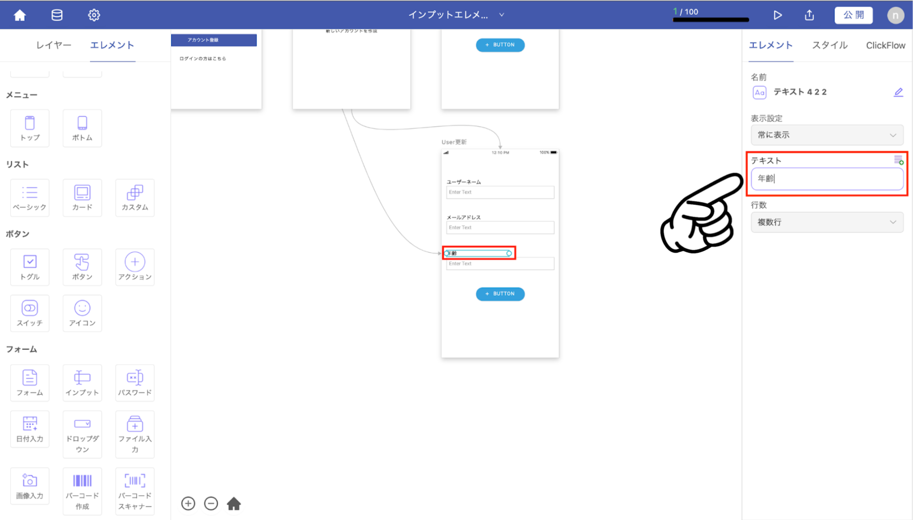 それぞれのテキストエレメントの名前を「ユーザーネーム」「メールアドレス」「年齢」に変更する。