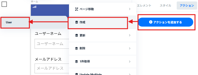ボタンを選択し、右ウインドウ「アクション > 作成 > User」を選択する。