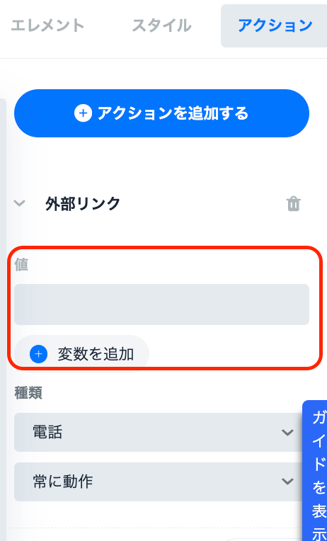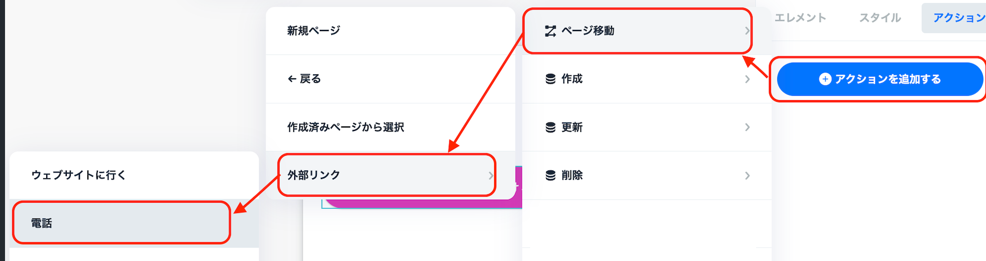 アクションを追加する>ページ移動>外部リンク>電話と設定