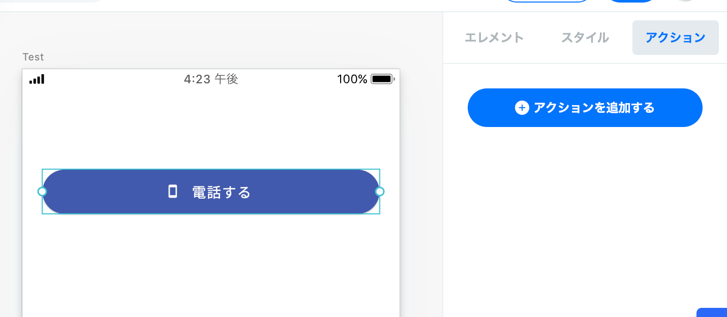実装したいエレメント(ボタンやアイコン、画像エレメント等)を設置し、アクションを追加する