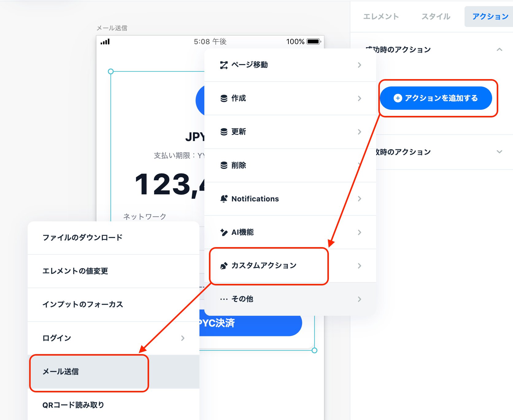 アクションを追加する>カスタムアクション>メール送信>と設定