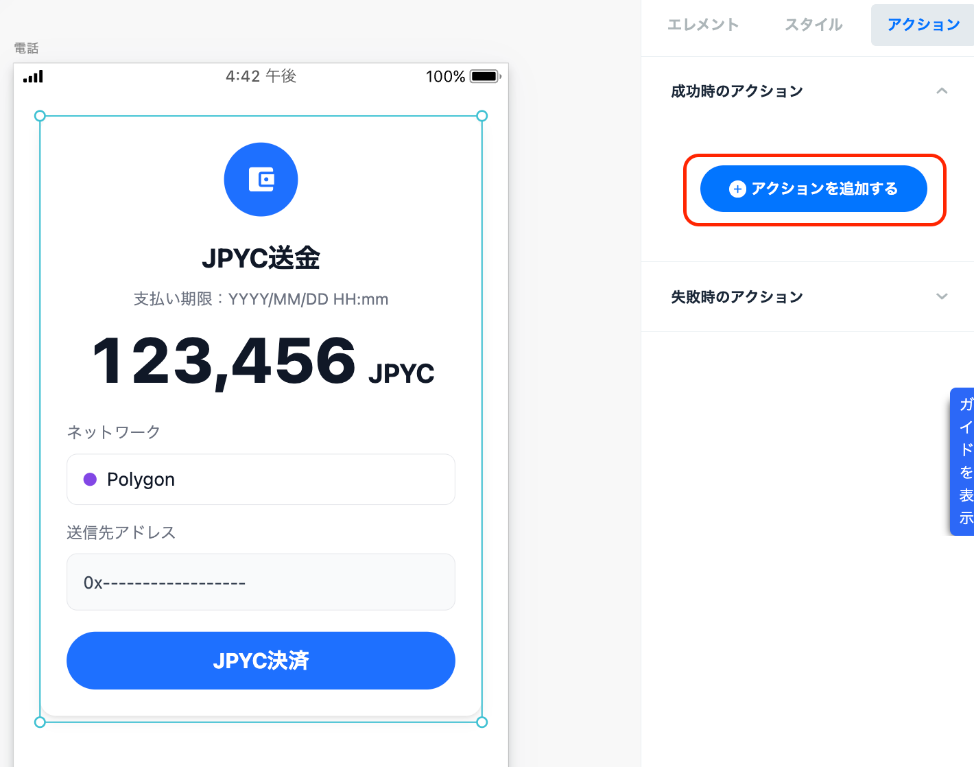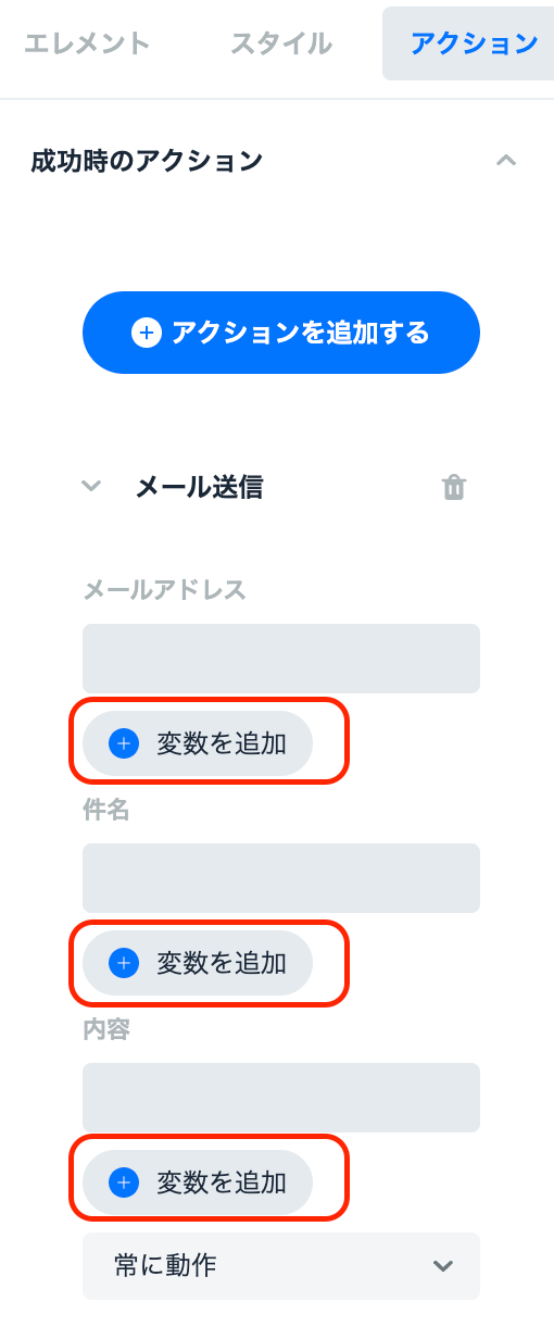 実装したい処理に対して、追加のアクションを設定する。