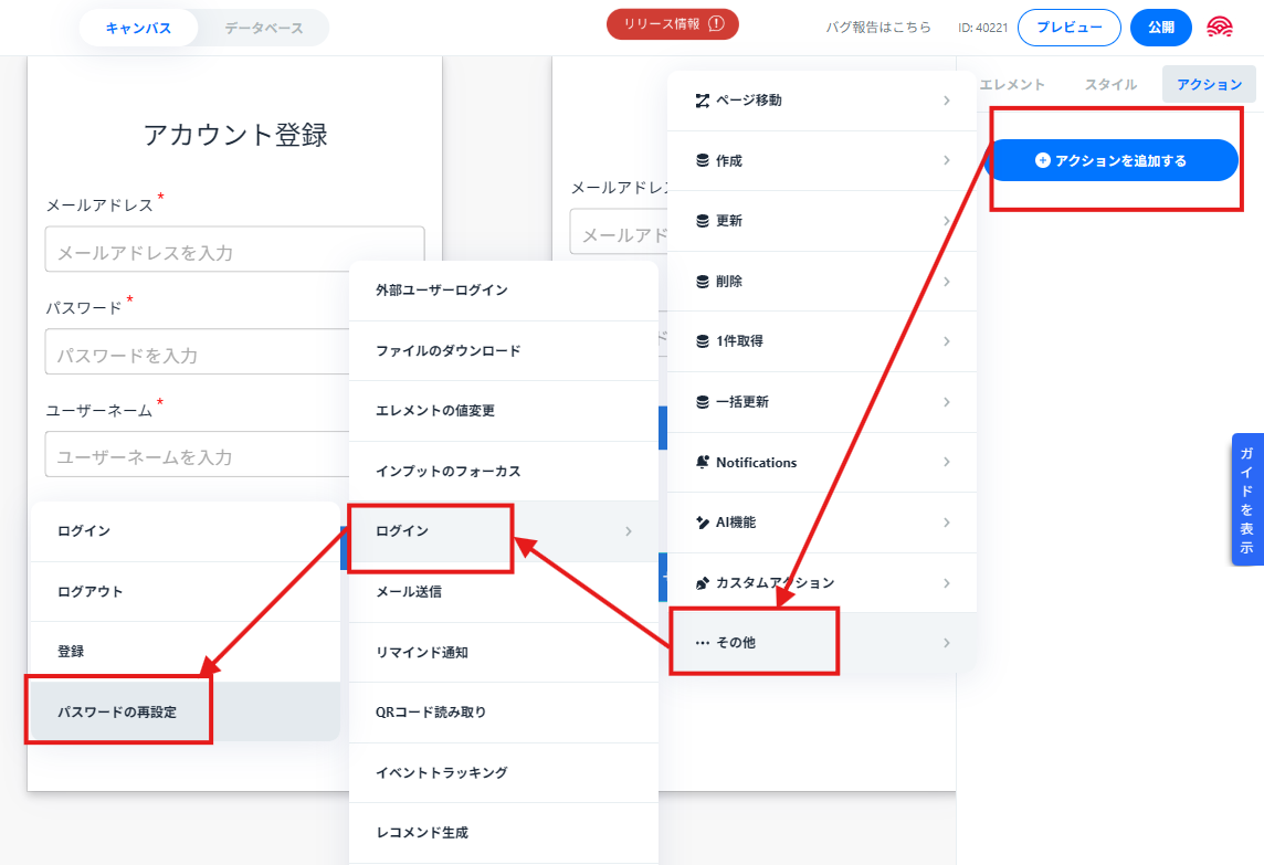 右ウインドウ「アクション」タブに移動し、「アクションの追加」から「その他 > ログイン > パスワードの再設定」を選択します。