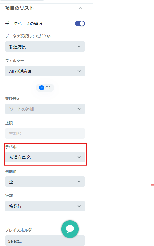 右側パネルの設定から、〔都道府県マスタ〕テーブルを選択してください。そのテーブルにある一つの項目を一覧表示することができます。