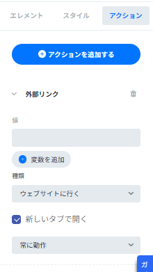 アクション、エレメントをクリックした時におこる、動作遷移になります。ページ移動や、データベースと連携してデータの追加・更新・削除等を行うときに利用します。